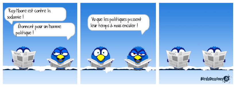 Case 1:Bird 1: Roy Moore est contre la sodomie ! Bird 2: Ètonnant pour un homme politique ! | Case 2: Bird 1: Vu que les politiques passent leur temps à nous enculer ! | Case 3: