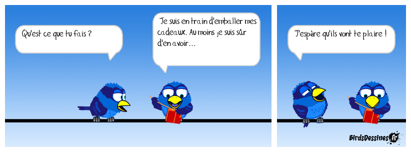 Case 1:Bird 1: Qu'est ce que tu fais ? | Case 2: Bird 1: Je suis en train d'emballer mes cadeaux. Au moins je suis sûr d'en avoir... | Case 3: Bird 1: J'espère qu'ils vont te plaire !