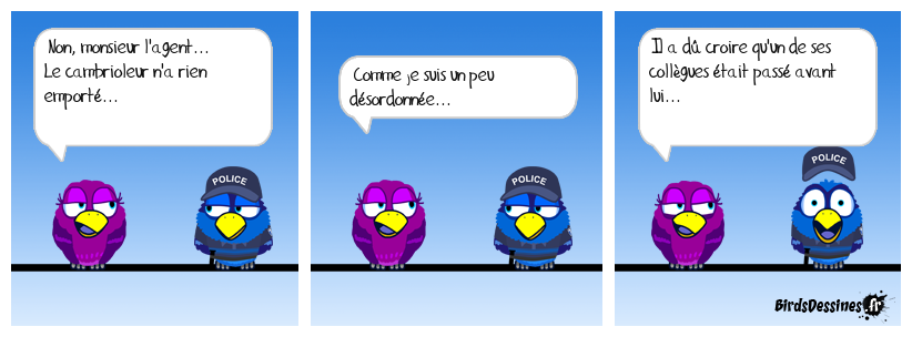 Case 1:Bird 1: Non, monsieur l'agent... Le cambrioleur n'a rien emporté... | Case 2: Bird 1: Comme je suis un peu désordonnée... | Case 3: Bird 1: Il a dû croire qu'un de ses collègues était passé avant lui...