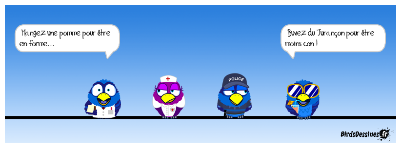Case 1:Bird 1: Mangez une pomme pour être en forme... | Case 2: | Case 3: Bird 1: Buvez du Jurançon pour être moins con !