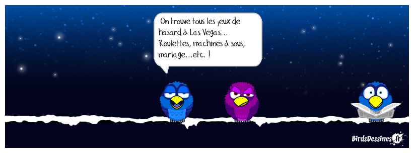 Case 1: | Case 2: Bird 1: On trouve tous les jeux de hasard à Las Vegas... Roulettes, machines à sous, mariage...etc. ! | Case 3: