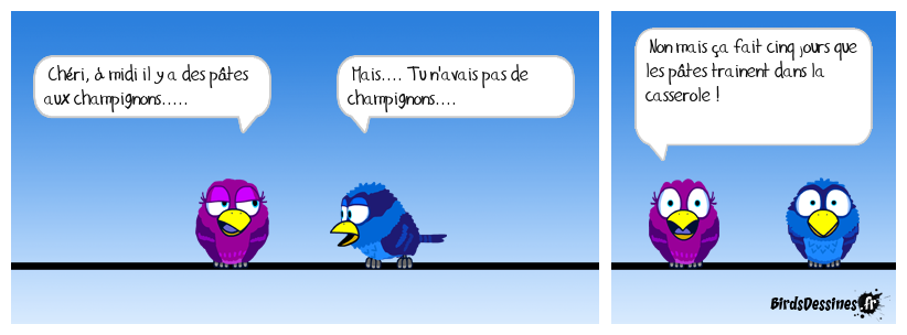 Case 1:Bird 1: Chéri, à midi il y a des pâtes aux champignons..... | Case 2: Bird 1: Mais.... Tu n'avais pas de champignons.... | Case 3: Bird 1: Non mais ça fait cinq jours que les pâtes trainent dans la casserole !