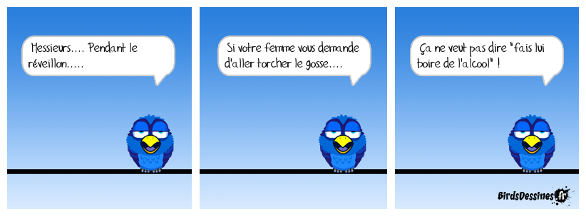 Case 1:Bird 1: Messieurs.... Pendant le réveillon..... | Case 2: Bird 1: Si votre femme vous demande d'aller torcher le gosse.... | Case 3: Bird 1: Ça ne veut pas dire "fais lui boire de l'alcool" !