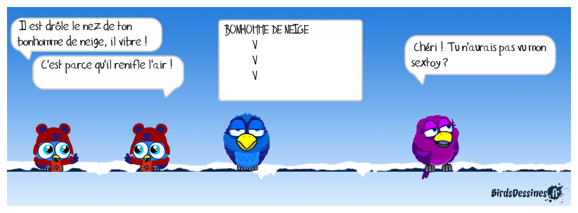Case 1:Bird 1: Il est drôle le nez de ton bonhomme de neige, il vibre !Bird 2: C'est parce qu'il renifle l'air ! | Case 2: Bird 1: BONHOMME DE NEIGE V V V | Case 3: Bird 1: Chéri ! Tu n'aurais pas vu mon sextoy ?