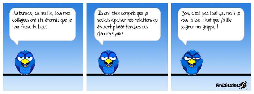 Case 1:Bird 1: Au bureau, ce matin, tous mes collègues ont été étonnés que je leur fasse la bise.. | Case 2: Bird 1: Ils ont bien compris que je voulais apaiser nos relations qui étaient plutôt tendues ces derniers jours.. | Case 3: Bird 1: Bon, c'est pas tout ça, mais je vous laisse, faut que j'aille soigner ma grippe !