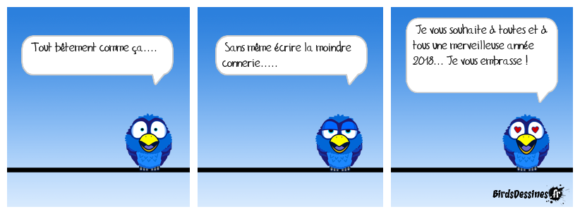 Case 1:Bird 1: Tout bêtement comme ça.... | Case 2: Bird 1: Sans même écrire la moindre connerie..... | Case 3: Bird 1: Je vous souhaite à toutes et à tous une merveilleuse année 2018... Je vous embrasse !