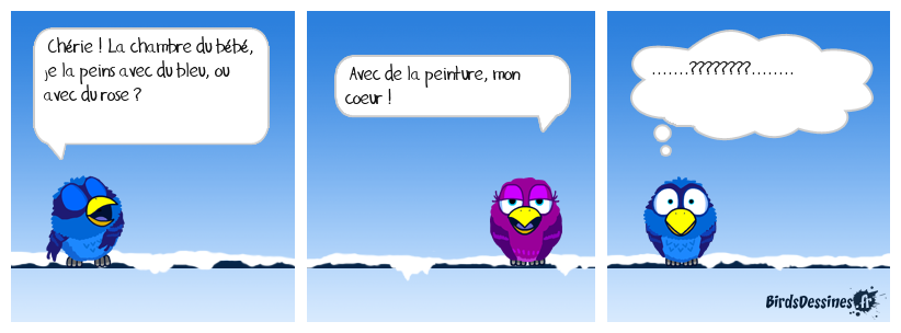 Case 1:Bird 1: Chérie ! La chambre du bébé, je la peins avec du bleu, ou avec du rose ? | Case 2: Bird 1: Avec de la peinture, mon coeur ! | Case 3: Bird 1: .......????????........