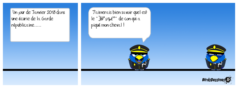 Case 1:Bird 1: Un jour de Janvier 2018 dans une écurie de la Garde républicaine..... | Case 2: Bird 1: J'aimerais bien savoir quel est le *]@"µ§£°* de con qui a piqué mon cheval ! | Case 3: