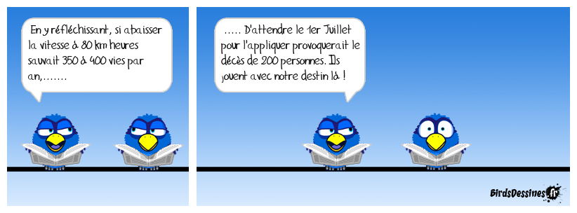Case 1:Bird 1: En y réfléchissant, si abaisser la vitesse à 80 km heures sauvait 350 à 400 vies par an,....... | Case 2: Bird 1: ..... D'attendre le 1er Juillet pour l'appliquer provoquerait le décès de 200 personnes. Ils jouent avec notre destin là ! | Case 3: