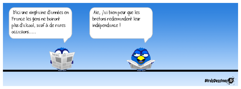 Case 1:Bird 1: D'ici une vingtaine d'années en France les gens ne boiront plus d'alcool, sauf à de rares occasions..... | Case 2: Bird 1: Aîe, j'ai bien peur que les bretons redemandent leur indépendance ! | Case 3: