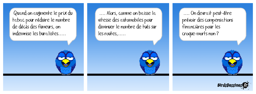 Case 1:Bird 1: Quand on augmente le prix du tabac pour réduire le nombre de décès des fumeurs, on indemnise les buralistes..... | Case 2: Bird 1: .... Alors, comme on baisse la vitesse des automobiles pour diminuer le nombre de tués sur les routes,..... | Case 3: Bird 1: .... On devrait peut-être prévoir des compensations financières pour les croque-morts non ?