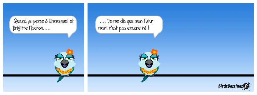 Case 1:Bird 1: Quand je pense à Emmanuel et Brigitte Macron..... | Case 2: Bird 1: .... Je me dis que mon futur mari n'est pas encore né ! | Case 3: