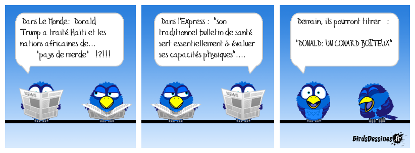 Case 1:Bird 1: Dans Le Monde: Donald Trump a traité Haîti et les nations africaines de... "pays de merde" !?!!! | Case 2: Bird 1: Dans l'Express : "son traditionnel bulletin de santé sert essentiellement à évaluer ses capacités physiques".... | Case 3: Bird 1: Demain, ils pourront titrer : "DONALD: UN CONARD BOITEUX"