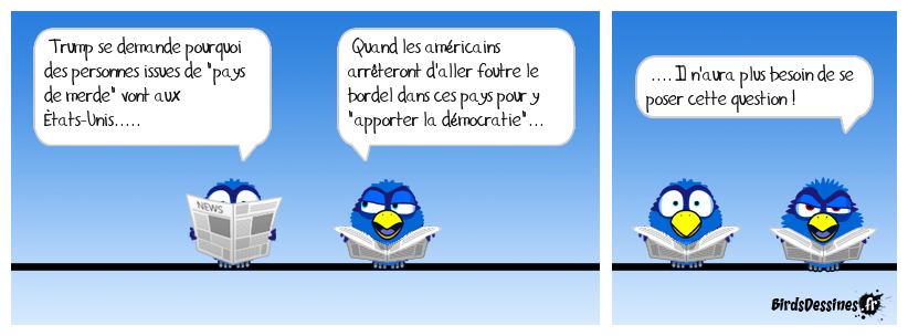 Case 1:Bird 1: Trump se demande pourquoi des personnes issues de "pays de merde" vont aux États-Unis..... | Case 2: Bird 1: Quand les américains arrêteront d'aller foutre le bordel dans ces pays pour y "apporter la démocratie"... | Case 3: Bird 1: .... Il n'aura plus besoin de se poser cette question !