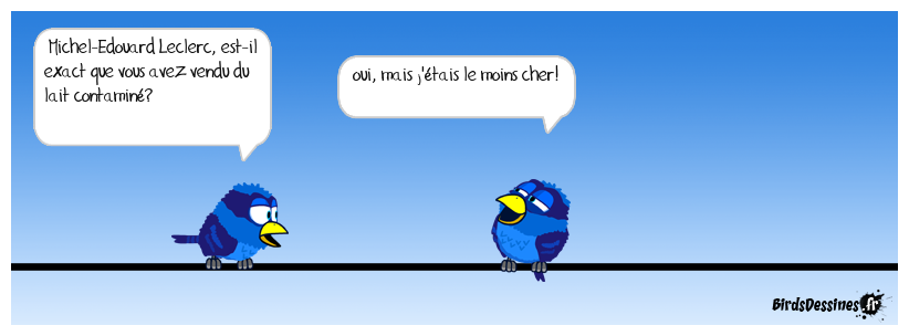 Case 1:Bird 1: Michel-Edouard Leclerc, est-il exact que vous avez vendu du lait contaminé? | Case 2: Bird 1: oui, mais j'étais le moins cher! | Case 3: