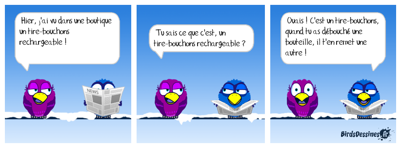 Case 1:Bird 1: Hier, j'ai vu dans une boutique un tire-bouchons rechargeable ! | Case 2: Bird 1: Tu sais ce que c'est, un tire-bouchons rechargeable ? | Case 3: Bird 1: Ouais ! C'est un tire-bouchons, quand tu as débouché une bouteille, il t'en remet une autre !