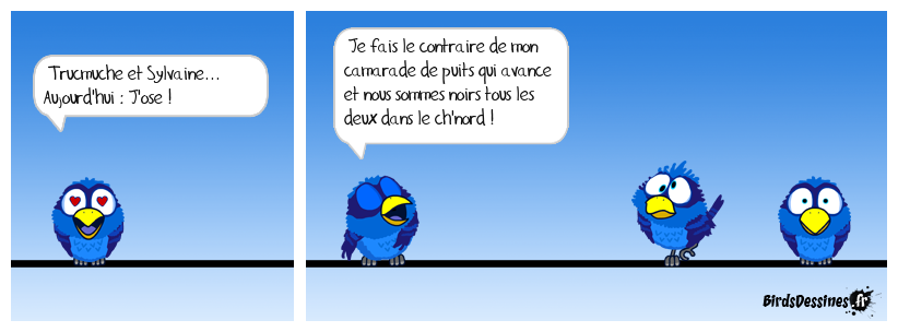 Case 1:Bird 1: Trucmuche et Sylvaine... Aujourd'hui : J'ose ! | Case 2: Bird 1: Je fais le contraire de mon camarade de puits qui avance et nous sommes noirs tous les deux dans le ch'nord ! | Case 3:
