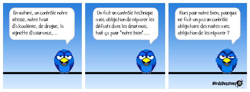 Case 1:Bird 1: En voiture, on contrôle notre vitesse, notre taux d'alcoolémie, de drogue, la vignette d'assurance,... | Case 2: Bird 1: On fait un contrôle technique avec obligation de réparer les défauts dans les deux mois, tout ça pour "notre bien".... | Case 3: Bird 1: Alors pour notre bien, pourquoi ne fait-on pas un contrôle obligatoire des routes avec obligation de les réparer ?