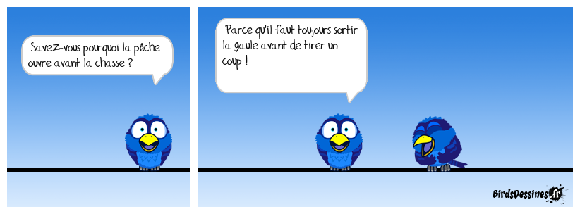 Case 1:Bird 1: Savez-vous pourquoi la pêche ouvre avant la chasse ? | Case 2: Bird 1: Parce qu'il faut toujours sortir la gaule avant de tirer un coup ! | Case 3: Bird 1: ... pour que les hommes comprennent que leur cerveau est aussi important que leurs couilles.