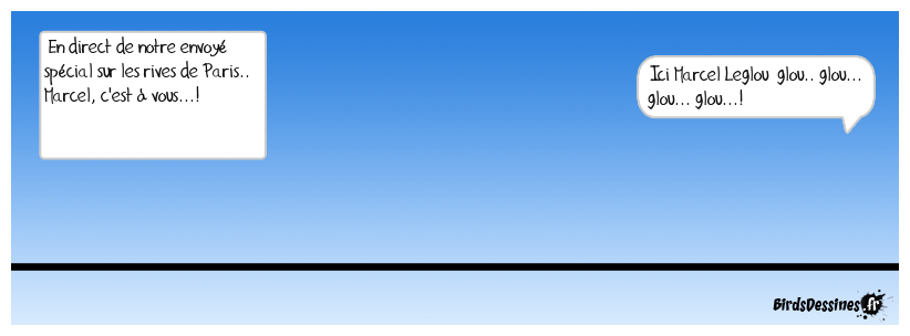 Case 1:Bird 1: En direct de notre envoyé spécial sur les rives de Paris.. Marcel, c'est à vous...! | Case 2: | Case 3: Bird 1: Ici Marcel Leglou glou.. glou... glou... glou...!