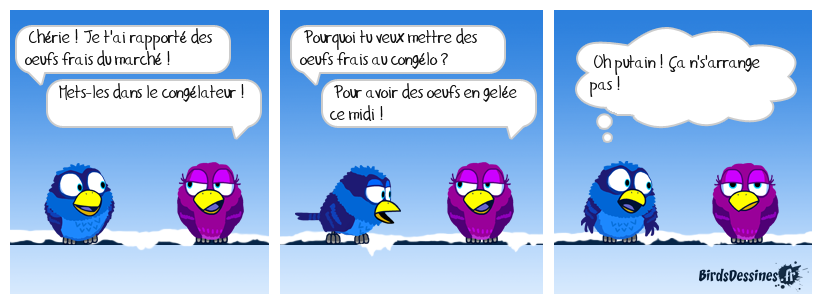 Case 1:Bird 1: Chérie ! Je t'ai rapporté des oeufs frais du marché !Bird 2: Mets-les dans le congélateur ! | Case 2: Bird 1: Pourquoi tu veux mettre des oeufs frais au congélo ? Bird 2: Pour avoir des oeufs en gelée ce midi ! | Case 3: Bird 1: Oh putain ! Ça n's'arrange pas !