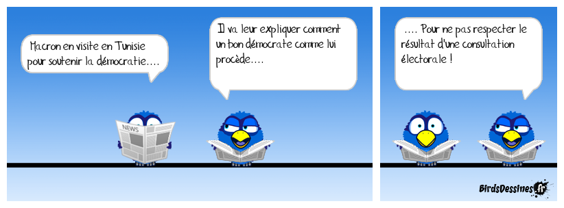 Case 1:Bird 1: Macron en visite en Tunisie pour soutenir la démocratie.... | Case 2: Bird 1: Il va leur expliquer comment un bon démocrate comme lui procède.... | Case 3: Bird 1: .... Pour ne pas respecter le résultat d'une consultation électorale !