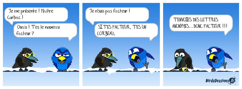 Case 1:Bird 1: Je me présente ! Maitre Corbac !Bird 2: Ouais ! T'es le nouveau facteur ? | Case 2: Bird 1: Je n'suis pas facteur ! Bird 2: SI T'ES FACTEUR, T'ES UN CORBEAU, | Case 3: Bird 1: T'ENVOIES DES LETTRES ANONYMES...DONC FACTEUR !!!