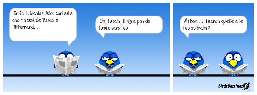 Case 1:Bird 1: En fait, Nicolas Hulot conteste avoir abusé de Pascale Mitterrand.... | Case 2: Bird 1: Oh, tu sais, il n'y a pas de fumée sans feu | Case 3: Bird 1: Ah bon.... Tu crois qu'elle a le feu au train ?