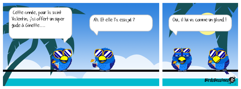 Case 1:Bird 1: Cette année, pour la saint Valentin, j'ai offert un super gode à Ginette.... | Case 2: Bird 1: Ah. Et elle l'a essayé ? | Case 3: Bird 1: Oui, il lui va comme un gland !