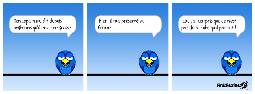 Case 1:Bird 1: Mon copain me dit depuis longtemps qu'il en a une grosse | Case 2: Bird 1: Hier, il m'a présenté sa femme..... | Case 3: Bird 1: Là, j'ai compris que ce n'est pas de sa bite qu'il parlait !