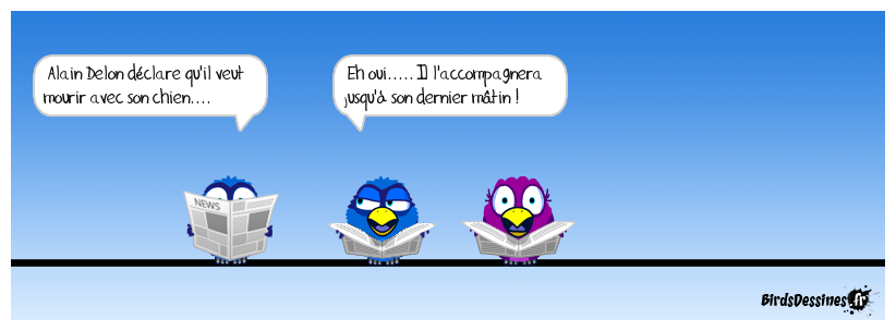 Case 1:Bird 1: Alain Delon déclare qu'il veut mourir avec son chien.... | Case 2: Bird 1: Eh oui..... Il l'accompagnera jusqu'à son dernier mâtin ! | Case 3:
