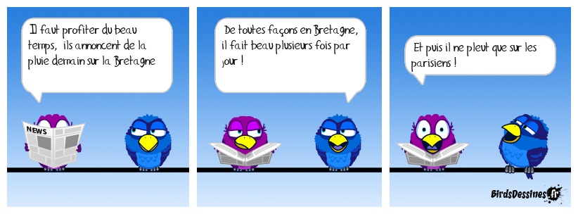 Case 1:Bird 1: Il faut profiter du beau temps, ils annoncent de la pluie demain sur la Bretagne | Case 2: Bird 1: De toutes façons en Bretagne, il fait beau plusieurs fois par jour ! | Case 3: Bird 1: Et puis il ne pleut que sur les parisiens !