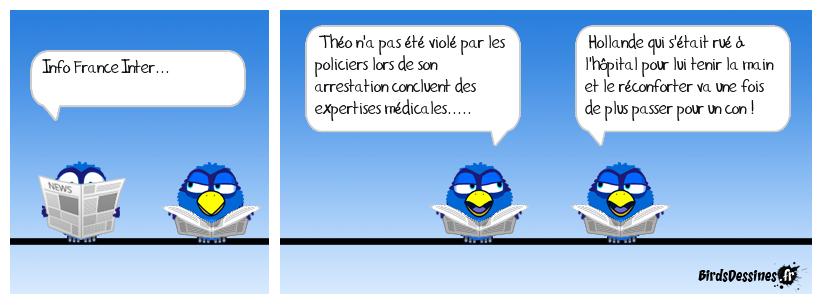 Case 1:Bird 1: Info France Inter... | Case 2: Bird 1: Théo n'a pas été violé par les policiers lors de son arrestation concluent des expertises médicales..... | Case 3: Bird 1: Hollande qui s'était rué à l'hôpital pour lui tenir la main et le réconforter va une fois de plus passer pour un con !