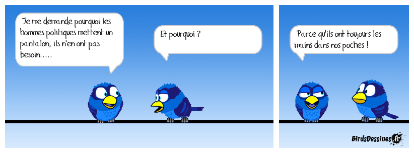 Case 1:Bird 1: Je me demande pourquoi les hommes politiques mettent un pantalon, ils n'en ont pas besoin..... | Case 2: Bird 1: Et pourquoi ? | Case 3: Bird 1: Parce qu'ils ont toujours les mains dans nos poches !