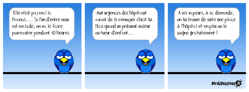 Case 1:Bird 1: Elle n'est pas mal la France..... Si l'un d'entre nous est malade, on va le faire poireauter pendant 10 heures | Case 2: Bird 1: Aux urgences des hôpitaux avant de le renvoyer chez lui. Mais quand un présumé violeur ou tueur d'enfant.... | Case 3: Bird 1: A ses vapeurs, à sa demande, on lui trouve de suite une place à l'hôpital et en plus on le soigne gratuitement !