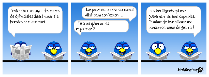 Case 1:Bird 1: Irak : face au juge, des veuves de djihadistes disent avoir été bernées par leur mari..... | Case 2: Bird 1: Les pauvres, on leur donnerait Allah sans confession.... Bird 2: Tu crois qu'on va les rapatrier ? | Case 3: Bird 1: Les intelligents qui nous gouvernent en sont capables... Et même de leur allouer une pension de veuve de guerre !