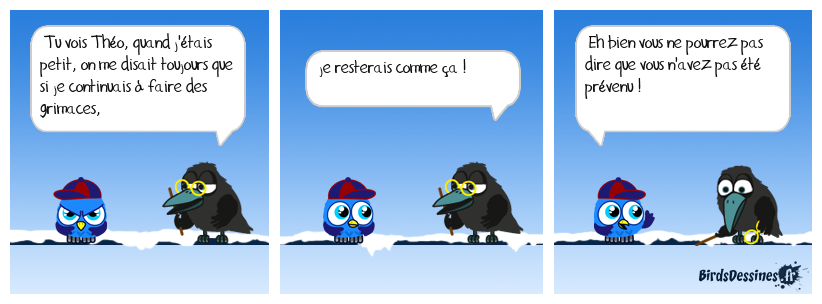 Case 1:Bird 1: Tu vois Théo, quand j'étais petit, on me disait toujours que si je continuais à faire des grimaces, | Case 2: Bird 1: je resterais comme ça ! | Case 3: Bird 1: Eh bien vous ne pourrez pas dire que vous n'avez pas été prévenu !