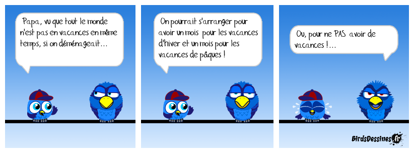Case 1:Bird 1: Papa, vu que tout le monde n'est pas en vacances en même temps, si on déménageait... | Case 2: Bird 1: On pourrait s'arranger pour avoir un mois pour les vacances d'hiver et un mois pour les vacances de pâques ! | Case 3: Bird 1: Ou, pour ne PAS avoir de vacances !...