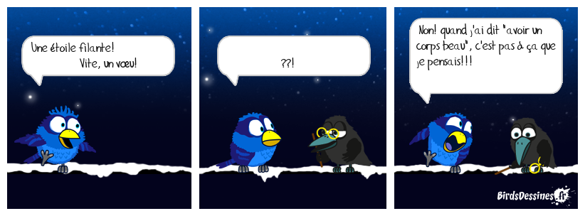Case 1:Bird 1: Une étoile filante! Vite, un vœu! | Case 2: Bird 1: ??! | Case 3: Bird 1: Non! quand j'ai dit "avoir un corps beau", c'est pas à ça que je pensais!!!