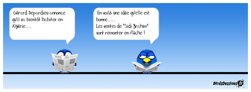 Case 1:Bird 1: Gérard Depardieu annonce qu'il va bientôt habiter en Algérie.... | Case 2: Bird 1: En voilà une idée qu'elle est bonne..... Les ventes de "Sidi Brahim" vont remonter en flèche ! | Case 3:
