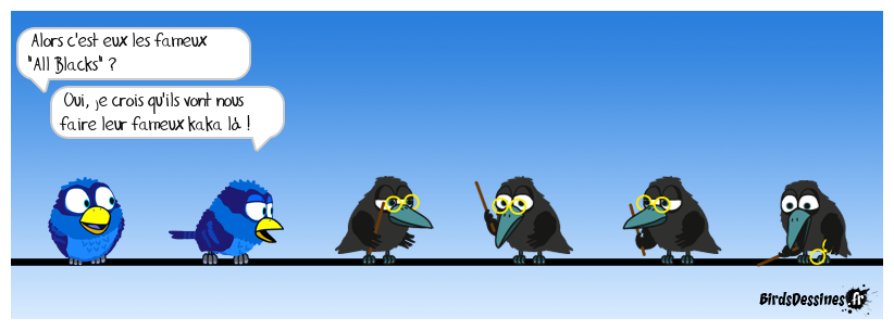 Case 1:Bird 1: Alors c'est eux les fameux "All Blacks" ? Bird 2: Oui, je crois qu'ils vont nous faire leur fameux kaka là ! | Case 2: | Case 3: