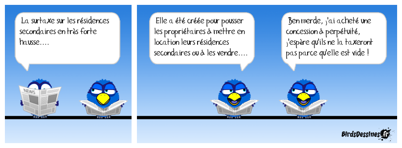 Case 1:Bird 1: La surtaxe sur les résidences secondaires en très forte hausse.... | Case 2: Bird 1: Elle a été créée pour pousser les propriétaires à mettre en location leurs résidences secondaires ou à les vendre.... | Case 3: Bird 1: Ben merde, j'ai acheté une concession à perpétuité, j'espère qu'ils ne la taxeront pas parce qu'elle est vide !