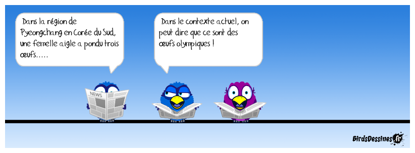 Case 1:Bird 1: Dans la région de Pyeongchang en Corée du Sud, une femelle aigle a pondu trois œufs..... | Case 2: Bird 1: Dans le contexte actuel, on peut dire que ce sont des œufs olympiques ! | Case 3: