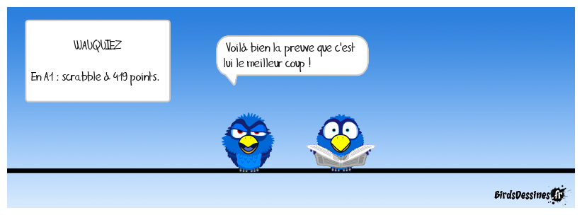 Case 1:Bird 1: WAUQUIEZ En A1 : scrabble à 419 points. | Case 2: Bird 1: Voilà bien la preuve que c'est lui le meilleur coup ! | Case 3: