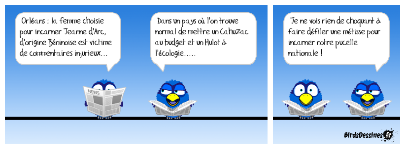 Case 1:Bird 1: Orléans : la femme choisie pour incarner Jeanne d'Arc, d'origine Béninoise est victime de commentaires injurieux... | Case 2: Bird 1: Dans un pays où l'on trouve normal de mettre un Cahuzac au budget et un Hulot à l'écologie..... | Case 3: Bird 1: Je ne vois rien de choquant à faire défiler une métisse pour incarner notre pucelle nationale !