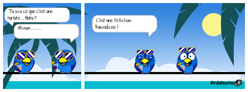 Case 1:Bird 1: Tu sais ce que c'est une turlute _ Hutu ? Bird 2: Ah non........ | Case 2: Bird 1: C'est une fellation Rwandaise ! | Case 3: