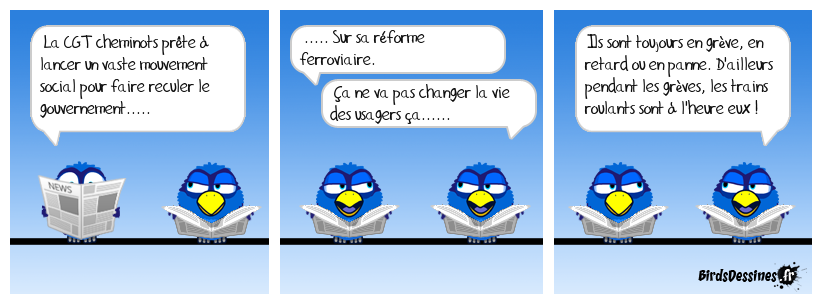 Case 1:Bird 1: La CGT cheminots prête à lancer un vaste mouvement social pour faire reculer le gouvernement..... | Case 2: Bird 1: ..... Sur sa réforme ferroviaire. Bird 2: Ça ne va pas changer la vie des usagers ça...... | Case 3: Bird 1: Ils sont toujours en grève, en retard ou en panne. D'ailleurs pendant les grèves, les trains roulants sont à l'heure eux !