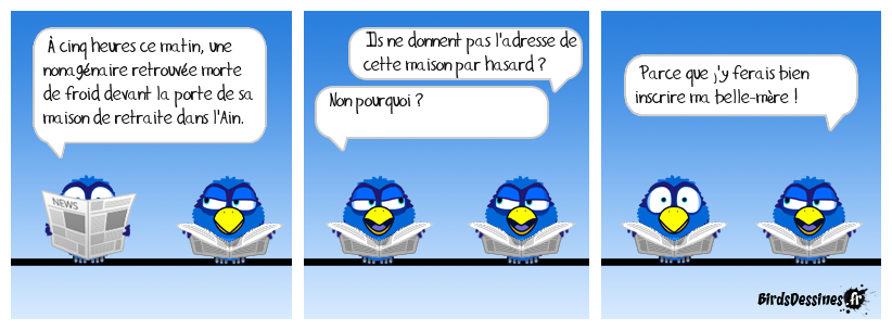Case 1:Bird 1: À cinq heures ce matin, une nonagénaire retrouvée morte de froid devant la porte de sa maison de retraite dans l'Ain. | Case 2: Bird 1: Ils ne donnent pas l'adresse de cette maison par hasard ? Bird 2: Non pourquoi ? | Case 3: Bird 1: Parce que j'y ferais bien inscrire ma belle-mère !