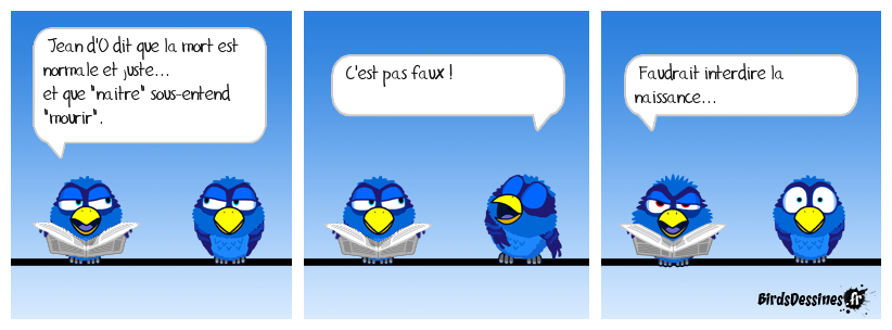 Case 1:Bird 1: Jean d'O dit que la mort est normale et juste... et que "naitre" sous-entend "mourir". | Case 2: Bird 1: C'est pas faux ! | Case 3: Bird 1: Faudrait interdire la naissance...