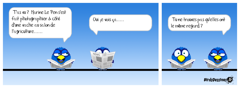 Case 1:Bird 1: T'as vu ? Marine Le Pen s'est fait photographier à côté d'une vache au salon de l'agriculture...... | Case 2: Bird 1: Oui je vois ça..... | Case 3: Bird 1: Tu ne trouves pas qu'elles ont le même regard ?